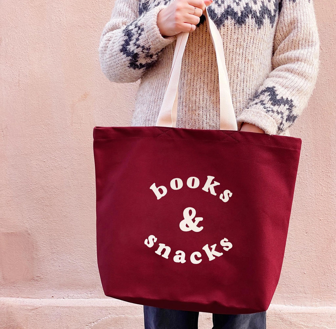 This hand illustrated 'Books & Snacks' design has been printed in off-white on sturdy burgundy canvas.