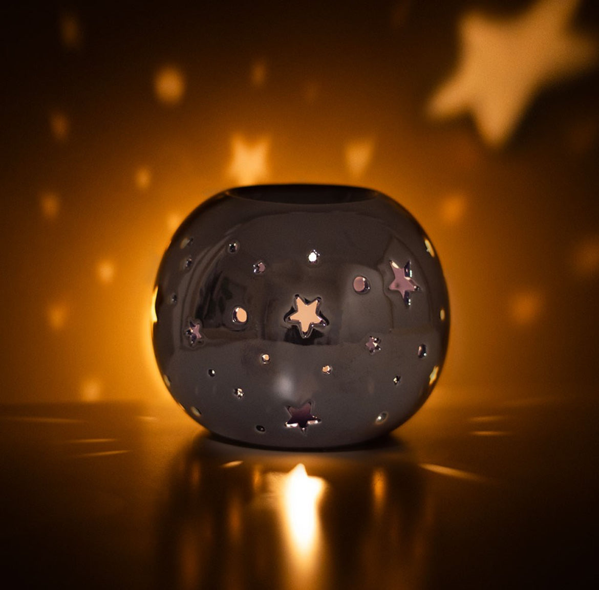 This purple iridescent oil burner and wax warmer adds a beautiful blend of mystic and whimsy to any space. With a radiant, shifting purple hue, it glows beautifully as light dances through the star-shaped cut outs.