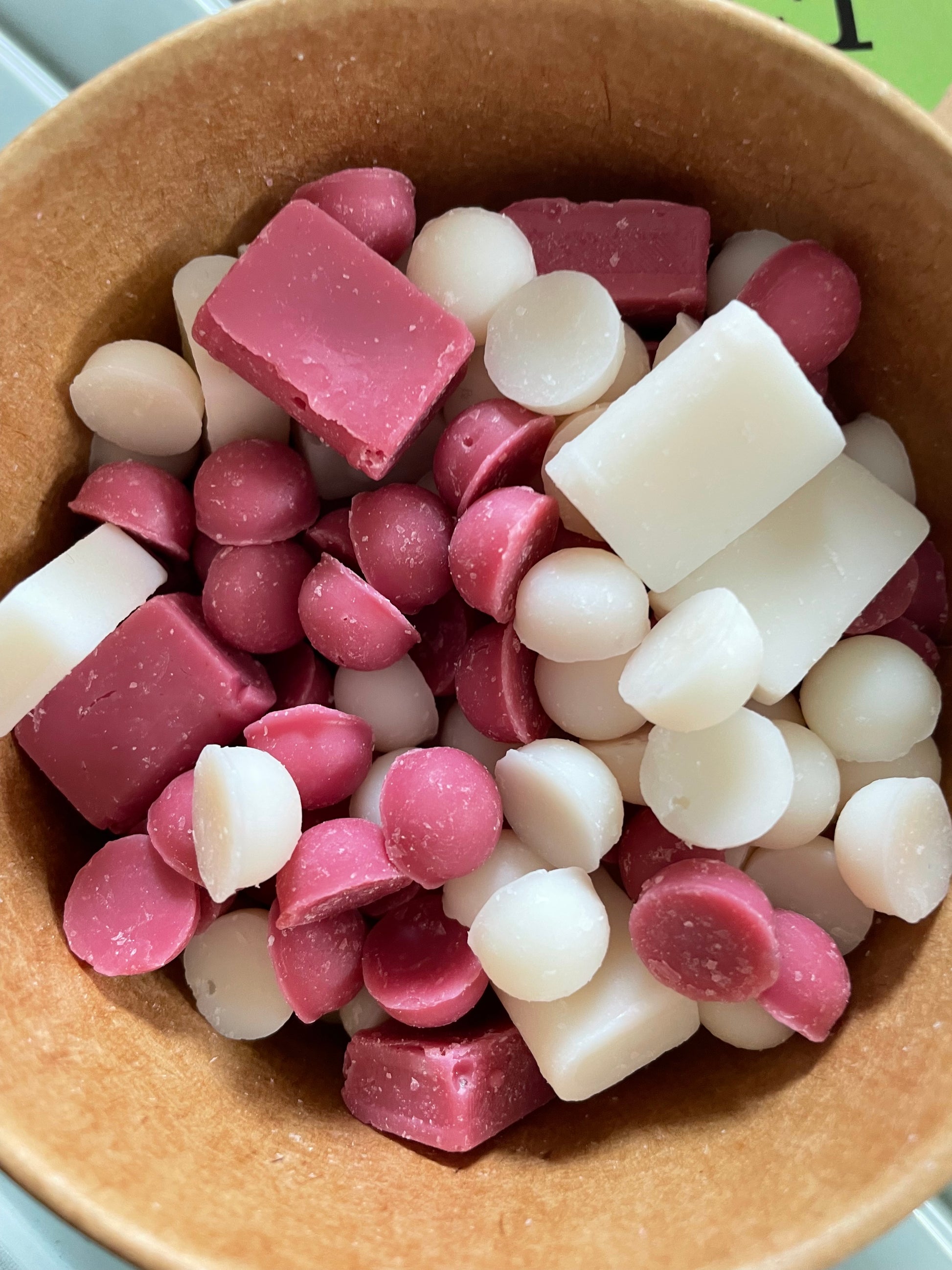 A 125g pot in the scent Tea Party. This includes a variety of dots and mini book shaped wax melts.
