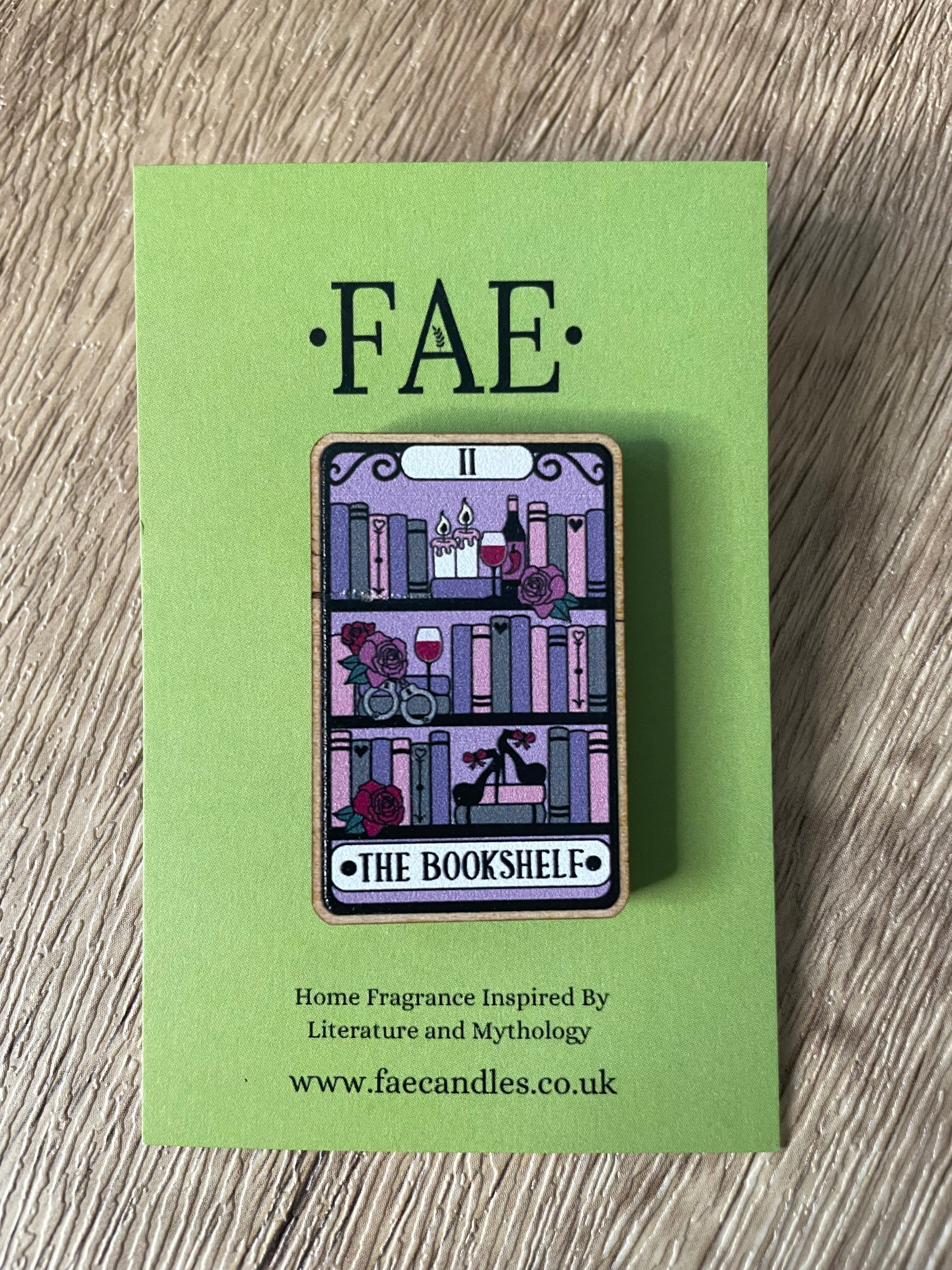 This pin badge is made from sustainably sourced cherry wood and has a green rubber backer.