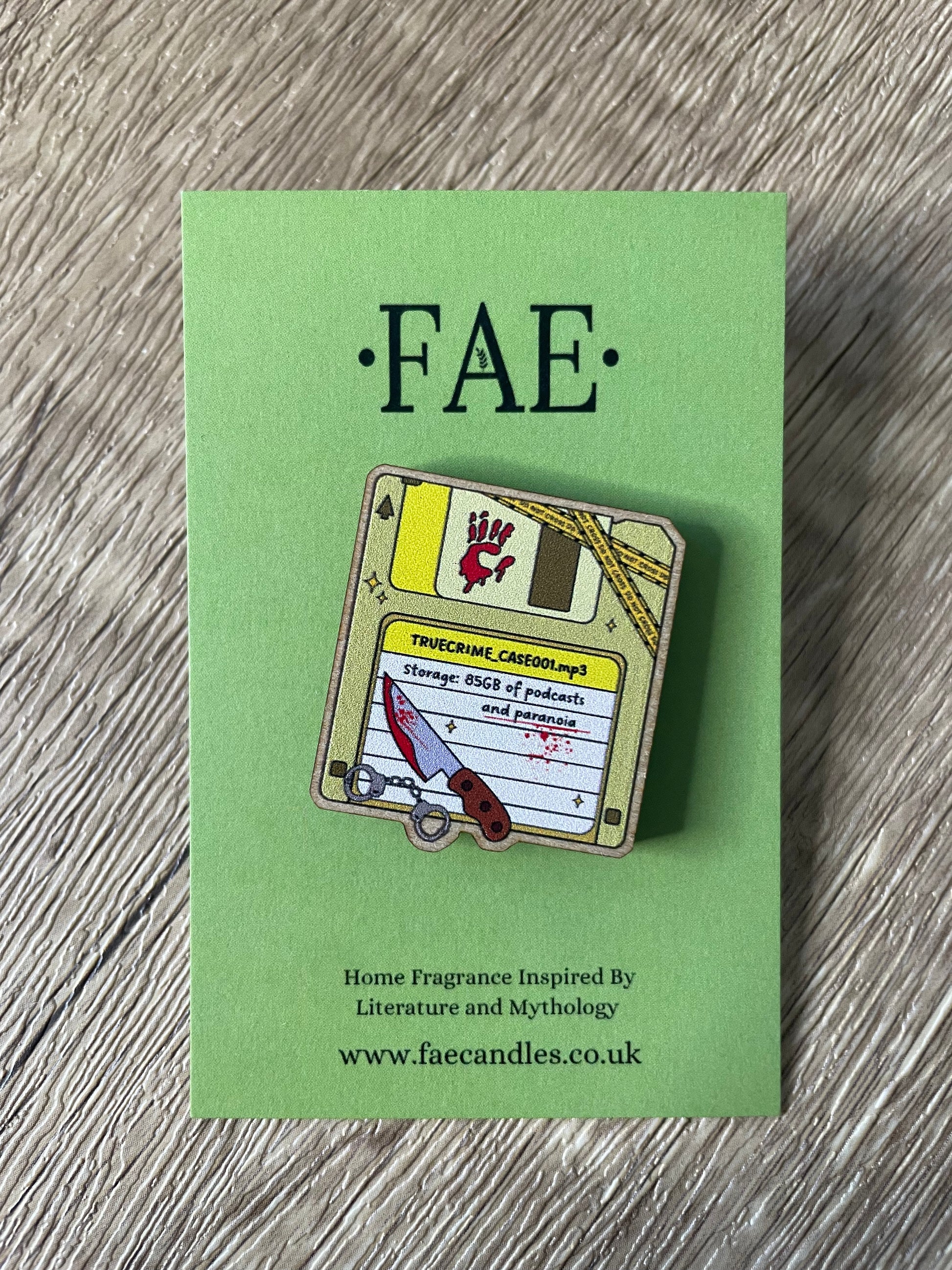This pin badge is made from sustainably sourced cherry wood and has a green rubber backer.